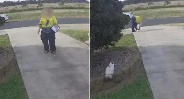 The video, recorded on the property of Julie and Steven Stephens, shows a council officer in high-visibility uniform approaching the driveway with a clipboard. Off camera, two cats can be heard or seen reacting to her presence. The worker then stepped backward toward the street, appearing to draw one of the cats out to the footpath. Once the cat followed, she picked it up and walked to her vehicle across the road.